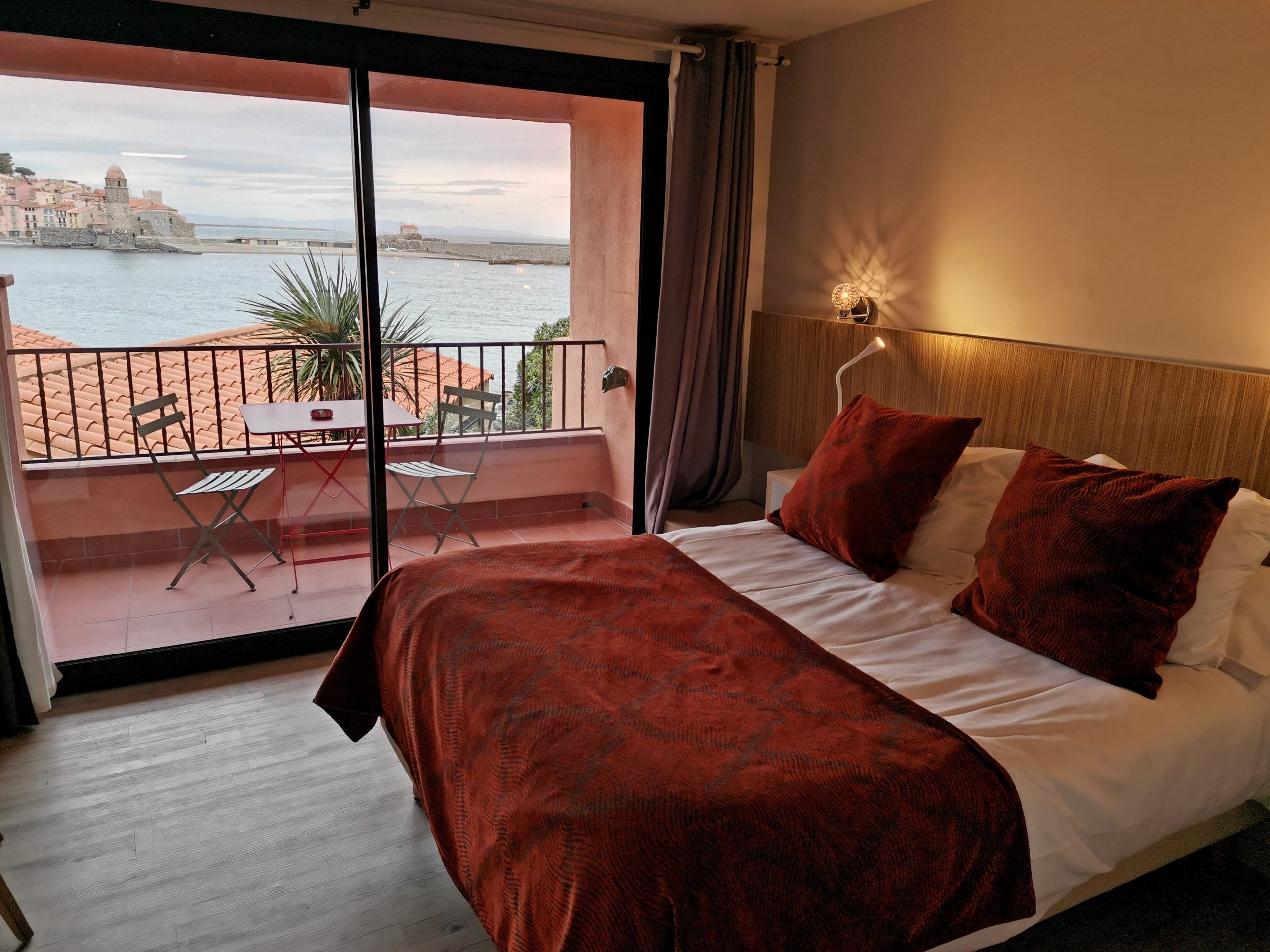 Une chambre avec un Balcon, vous offrant une Jolie Vue sur Collioure et la Baie, avec une Salle de bain avec Douche à l'Italienne